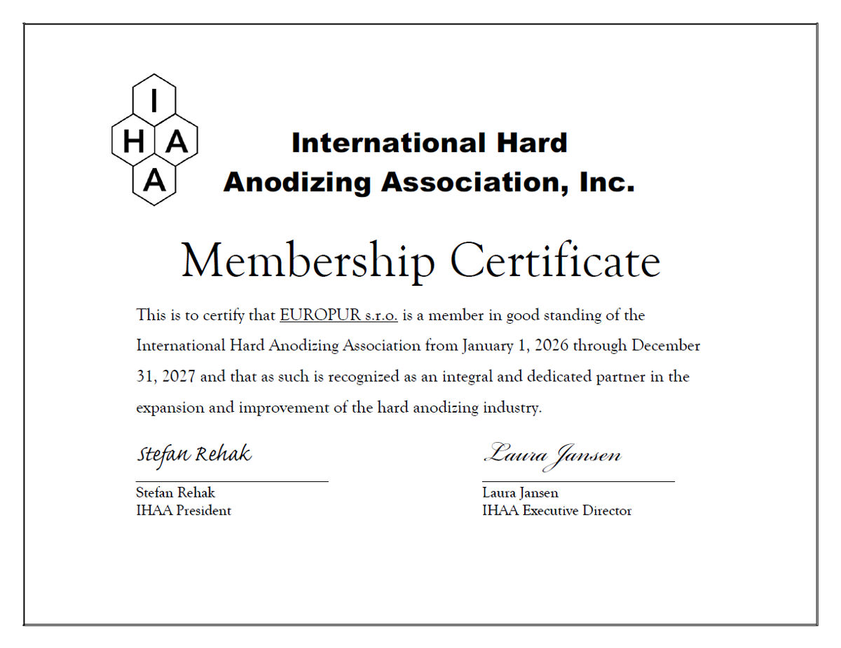 Az Europur, s.r.o. társaság az IHAA (International Hard Anodizing Association) aktív tagja, nemzetközi szinten kapcsolódik be az alumínium anódos oxidációja területén kifejtett szaktevékenységbe. www.ihanodizing.com